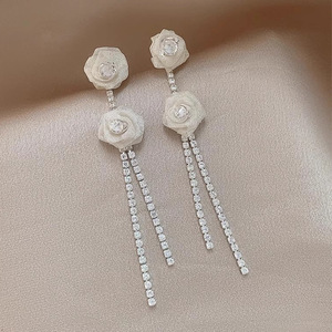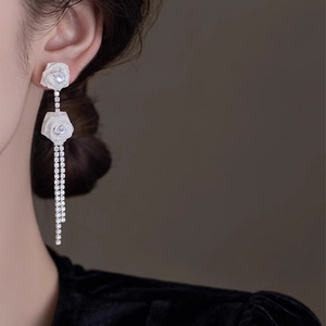 香槟白网纱玫瑰花耳环轻奢高级感爆款耳钉长款锆石超仙流苏耳饰女