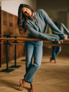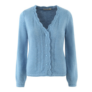 跨境亚马逊欧美 法式慵懒风复古雾霾马海毛V领钩花泡泡袖针织开衫