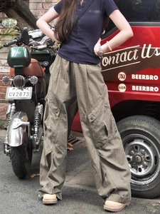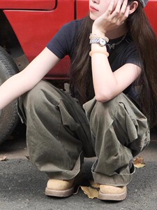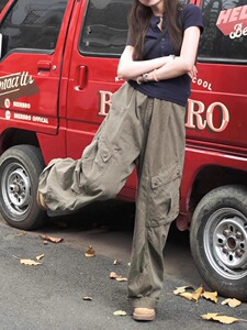 【韩牛】美式复古水洗褶皱口袋工装牛仔裤女宽松阔腿休闲直筒裤