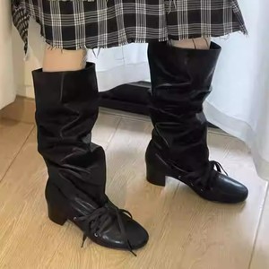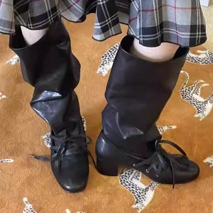 复古绑带新款小众设计感裤筒靴粗跟厚底长靴不过膝尖头系带骑士靴