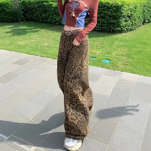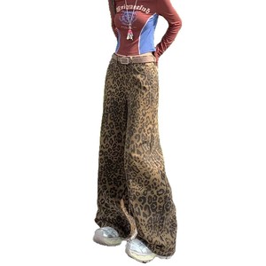 【韩牛】美式高街复古豹纹阔腿牛仔裤女秋季高腰宽松直筒拖地裤子