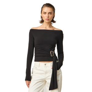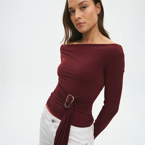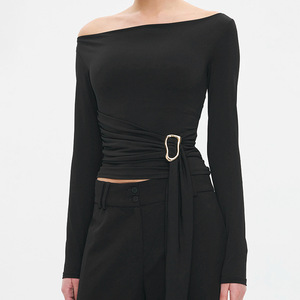 Y25TP324 欧美女装秋季亚马逊新款纯色一字领飘带修身长袖T恤上衣