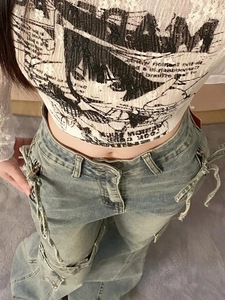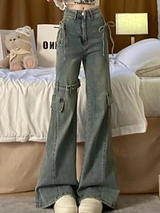 【韩牛】美式辣妹街头高腰显瘦宽松复古绑带蝴蝶结微喇叭牛仔裤女