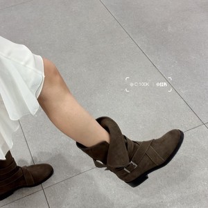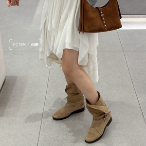 韩版小众绒面粗跟皮带扣粗跟小方头短靴瘦瘦靴女秋冬季西部牛仔靴