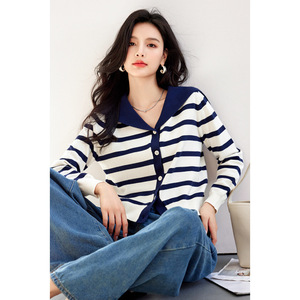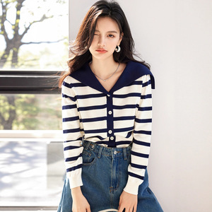 蓝白条纹针织开衫女2025秋季新款海军领上衣薄款长袖外套A5937
