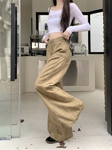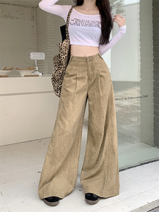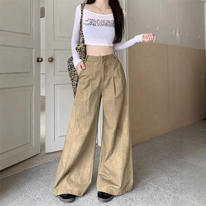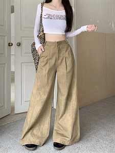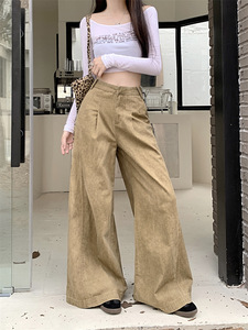 【韩牛】胖MM秋新款宽松显瘦设计感阔腿做旧水洗败叶黄色牛仔裤
