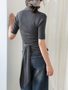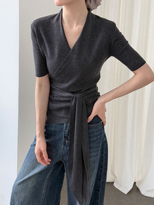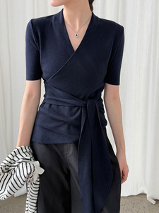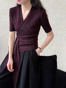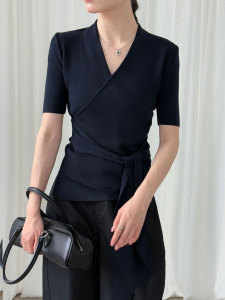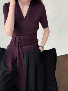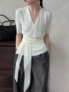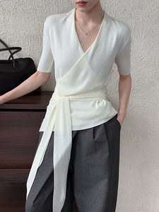 鹿西 不规则绑带羊毛针织衫女25秋季新款设计感收腰V领小衫ss772