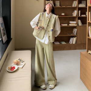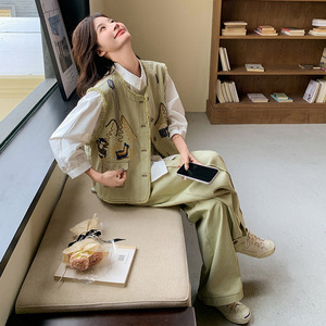 牛仔刺绣马甲时尚套装女2025春秋新款超火穿搭一整套阔腿裤三件套