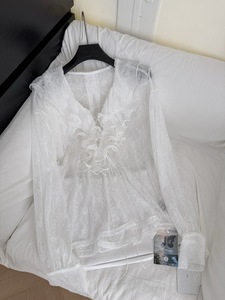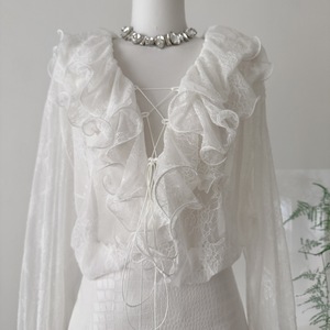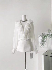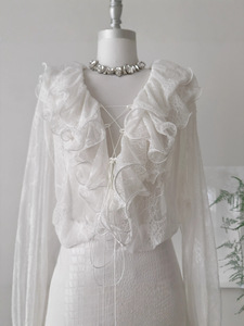 『欣幸』迷情法意白色蕾丝上衣女夏薄款宽松长袖荷叶领系带衬衫