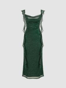 2025新款跨境代发女式纯色闪光荷叶边连衣裙 正式优雅