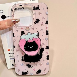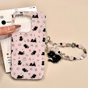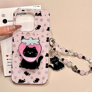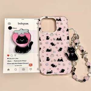 韩系草莓小黑猫支架链条适用iPhone16promax苹果15手机壳14新款13