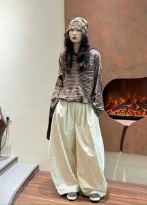 秋季新品简约圆领舒适显瘦百搭宽松休闲双纱撞色条纹长袖T恤上衣