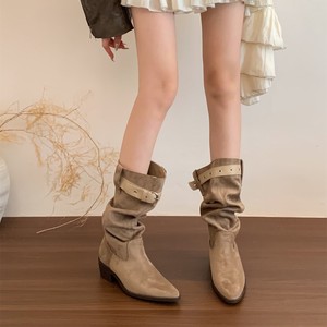 "美式慵懒"复古褶皱堆堆靴女秋冬尖头西部牛仔长靴粗跟中筒骑士靴