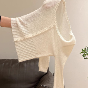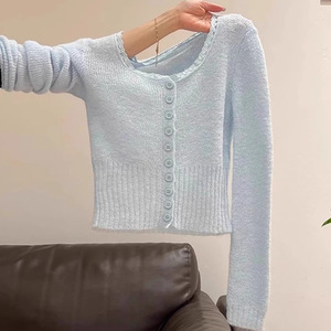 巨显白软糯小香风软糯奶黄色拼接蕾丝花边韩系女款针织衫开衫上衣