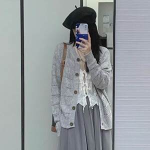 韩系灰色镂空毛衣外套女士新款早秋chic设计感外搭针织衫开衫上衣