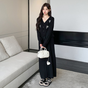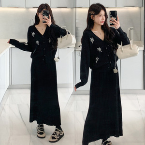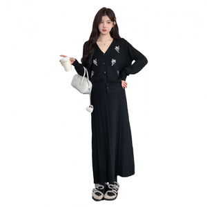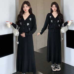 现货2025秋季黑色V领孕妇针织上衣半身裙两件套秋季孕妇套装