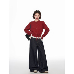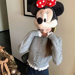 杏色假两件蕾丝针织毛衣女秋冬季小个子短款收腰开衫外套上衣