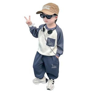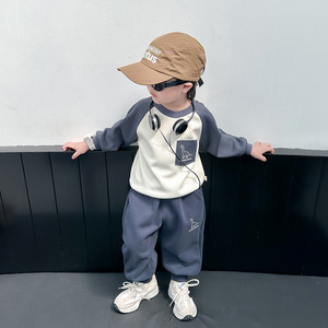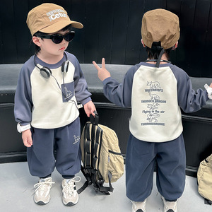 小童男童套装春秋新款儿童卡通恐龙印花撞色休闲时尚卫衣两件套潮