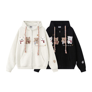 2025秋冬新款美式复古植绒可爱小狗百搭宽松休闲连帽开衫卫衣男女