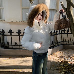 冬季百搭藏青色连帽毛领短款棉衣棉袄女新款保暖加厚羽绒棉服外套