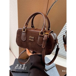 感手提包包女2025新款潮流行美拉德麂皮绒单肩包斜挎保龄球包黑色