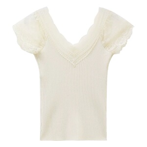 2025年新款夏季蕾丝花边v领针织短袖T恤女薄款修身内搭打底上衣