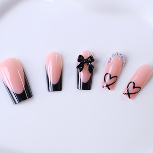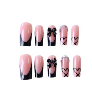 跨境热销款美甲欧美高级时尚辣妹黑法式蝴蝶结闪钻长款穿戴甲批发
