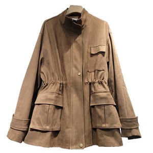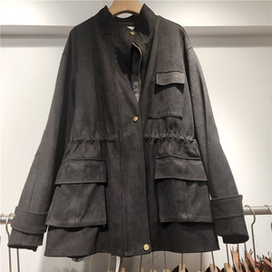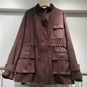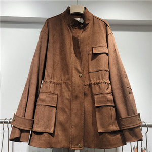 2025秋英伦立领夹克高质感潮麂皮绒外套女复古抽绳收腰工装上衣