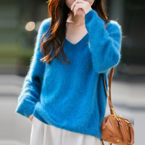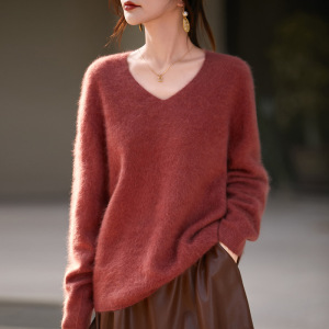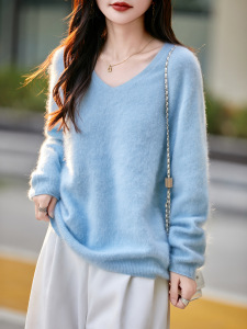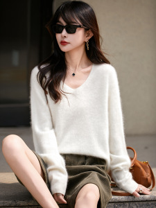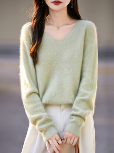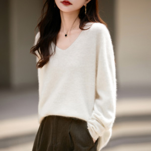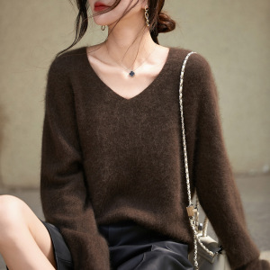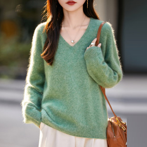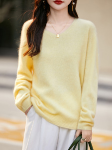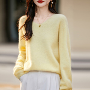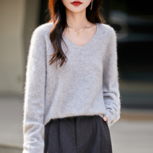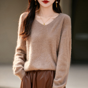 【】韩系百搭5%山羊绒95羊毛V领无缝拉毛羊绒衫女毛衣25无缝针织