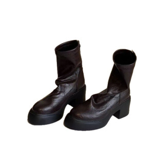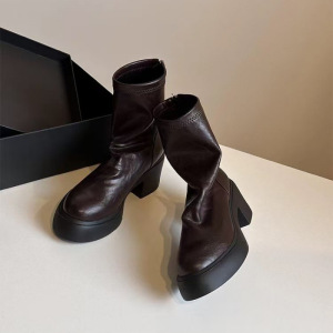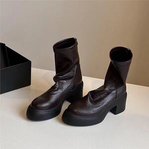 牛皮版~简约复古英伦风马丁靴女后拉链厚底防水台高跟弹力瘦瘦靴