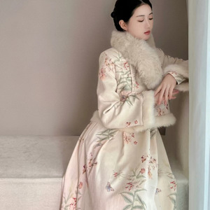 秋冬新中式复古改良旗袍碎花连衣裙毛边拼接加绒加厚外套装裙女