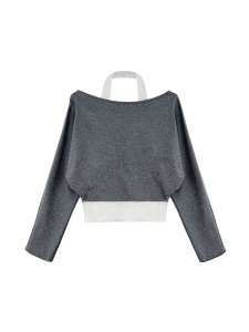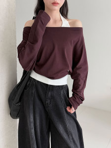鹿西 韩系拼接假两件挂脖长袖T恤女秋季新设计感气质露肩上衣2020