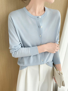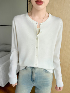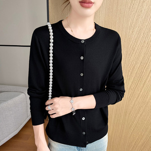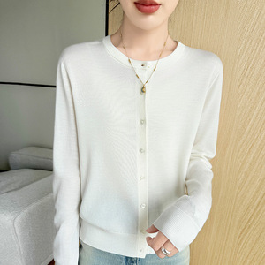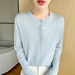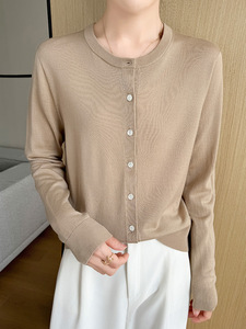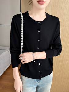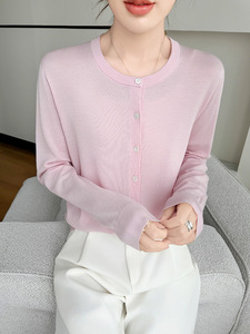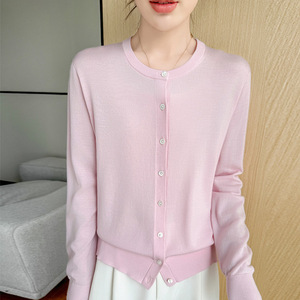 2025年早秋季新款薄款精纺羊毛圆领开衫女纯色透气百搭针织上衣