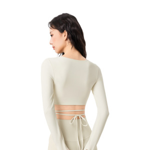跨境短款正肩瑜伽服长袖女斜领绑带运动上衣带胸垫修身显瘦健身服