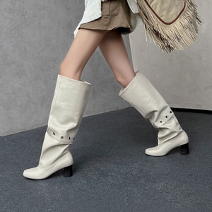 秋冬新款棕色牛皮可拆卸套筒两穿长筒靴~圆头铆钉粗高跟瘦瘦靴女