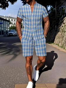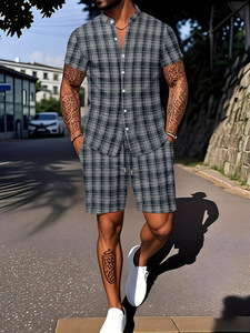 跨境男装新款透气舒适立领格子短袖衬衫+抽绳短裤男士休闲套装