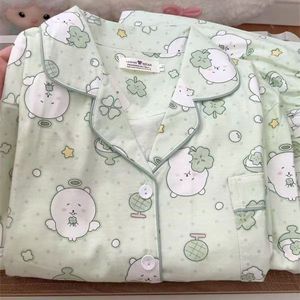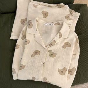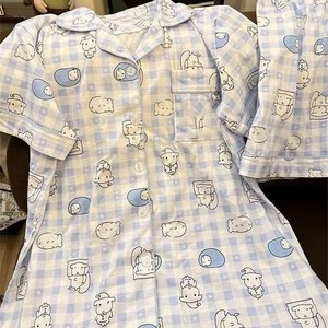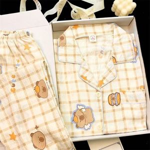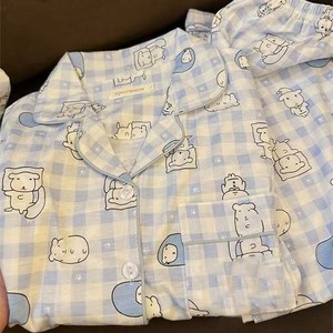 卡通蓝格小熊睡衣女春秋季长袖长裤ins套装日系少女可外穿家居服