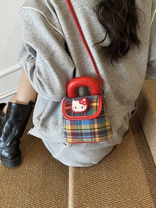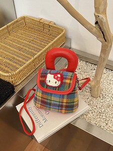 2025复古可爱猫彩色撞色格子手提包精致ins风单肩斜挎迷你水桶包