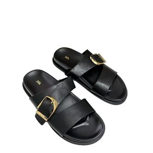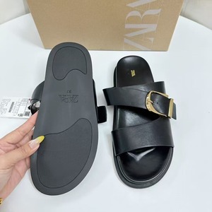 ZA女鞋2025新款经典黑色厚底小羊皮欧美交叉方扣饰外出沙滩凉拖鞋