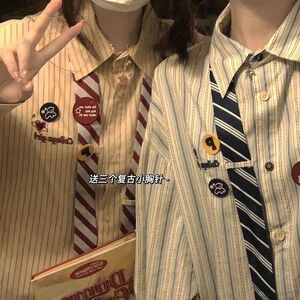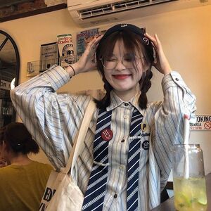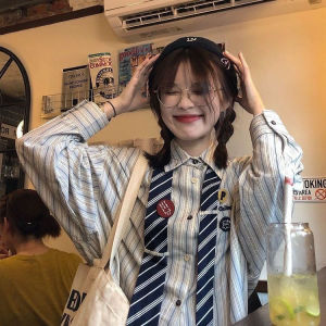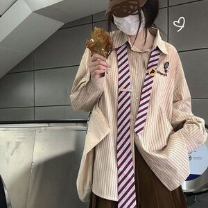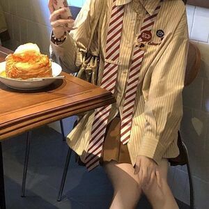 领带条纹衬衫女秋季新款学院风宽松古着vintage感学生衬衣闺蜜装