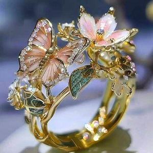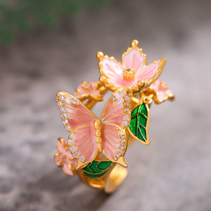 欧美跨境新款彩色滴油蝴蝶铜戒指创意设计精品花朵时尚指环饰品