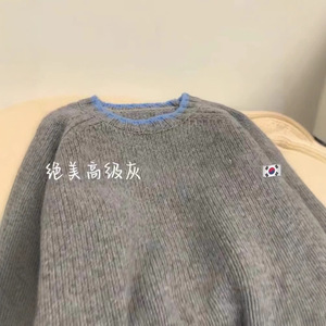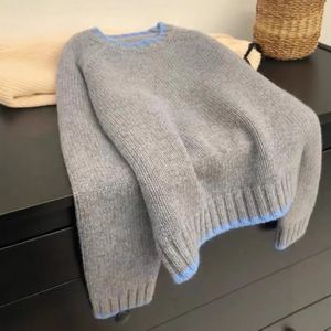 欧货重磅羊毛衫女秋冬厚宽松软糯拼色圆领短款羊毛针织打底衫毛衣