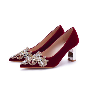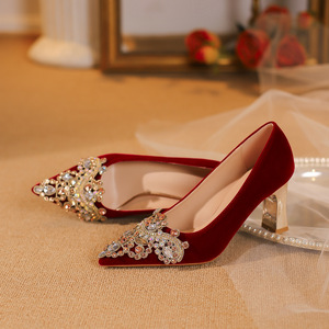 【Y-919-31】尖头粗跟绒面红色高跟鞋女胖脚宽婚鞋大码加肥新娘鞋