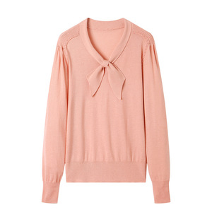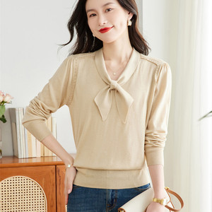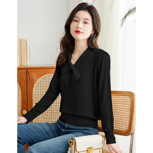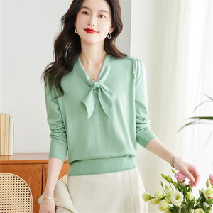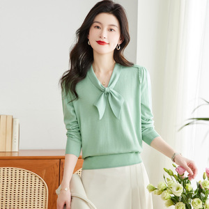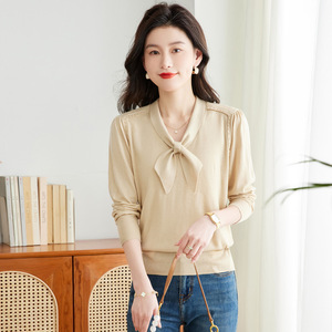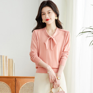 2025新款春秋季时尚洋气飘带长袖t恤蝴蝶结打底衫女人味针织上衣
