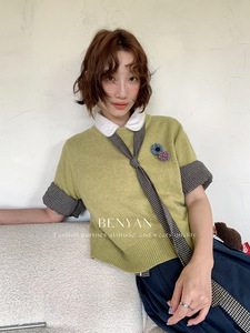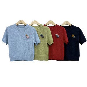 BENYAN本言 法式花朵装饰圆领短袖针织衫女秋季百搭羊毛上衣3573