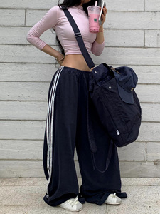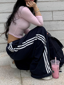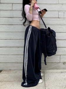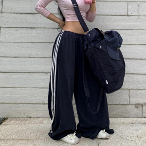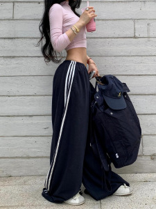 藏蓝色运动阔腿裤女春夏季设计感三条杠宽松百搭慵懒风直筒休闲裤