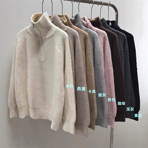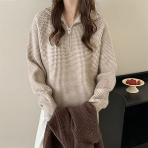 设计感高领半拉链华夫格针织衫上衣女秋冬新款气质宽松套头毛衣女