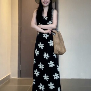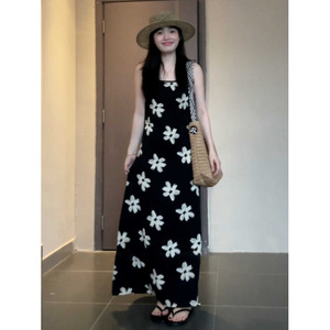 法式海边度假黑色吊带碎花连衣裙子女夏季2025新款小个子气质长裙