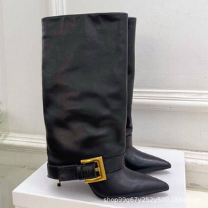 Balm韩版牛皮复古骑士靴高跟尖头皮带扣裤管靴秋冬新款真皮马丁靴