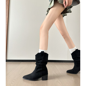 2025新款磨砂绒面V口西部牛仔靴女复古中筒靴粗跟套筒堆堆靴显瘦